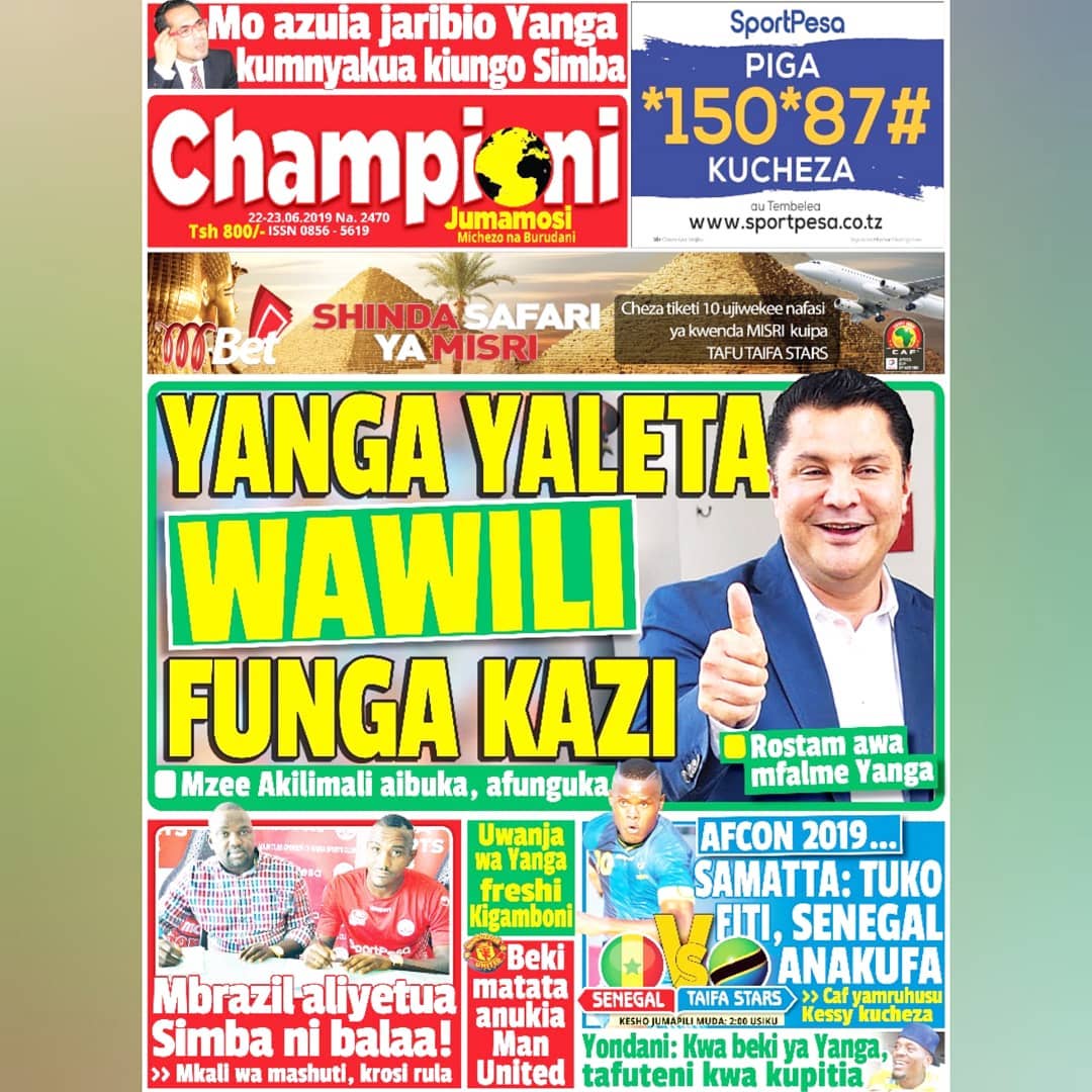 Ukurasa wa mbele wa gazeti la Championi leo Jumamosi