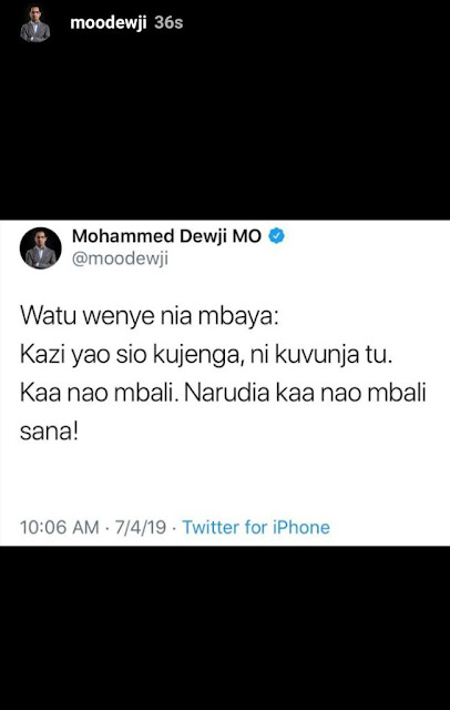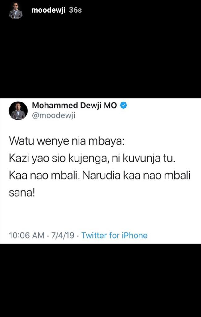 Mo ameandika kwamba : “Watu wenye nia mbaya. kazi yao ni kuvunja tu. Kaa nao mbali, narudia kaa nao mbali sana.