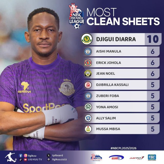 Orodha hiyo pia inamjumuisha Jean Noel wa TRA United mwenye michezo sita bila kufungwa. Wengine ni Djobrilla Kassali, Zuberi Foba, Yona Amosi, Ally Salim na Mussa Mbisa, kila mmoja akiwa na clean sheets tano.